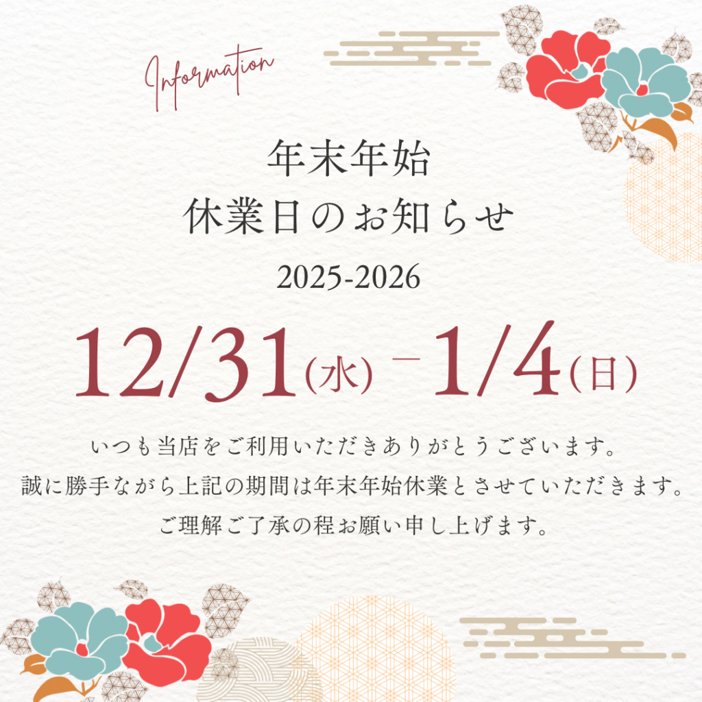 誠に勝手ながら、2025年12月31日(水)〜2026年1月4日(日)の期間は年末年始休業とさせていただきます。